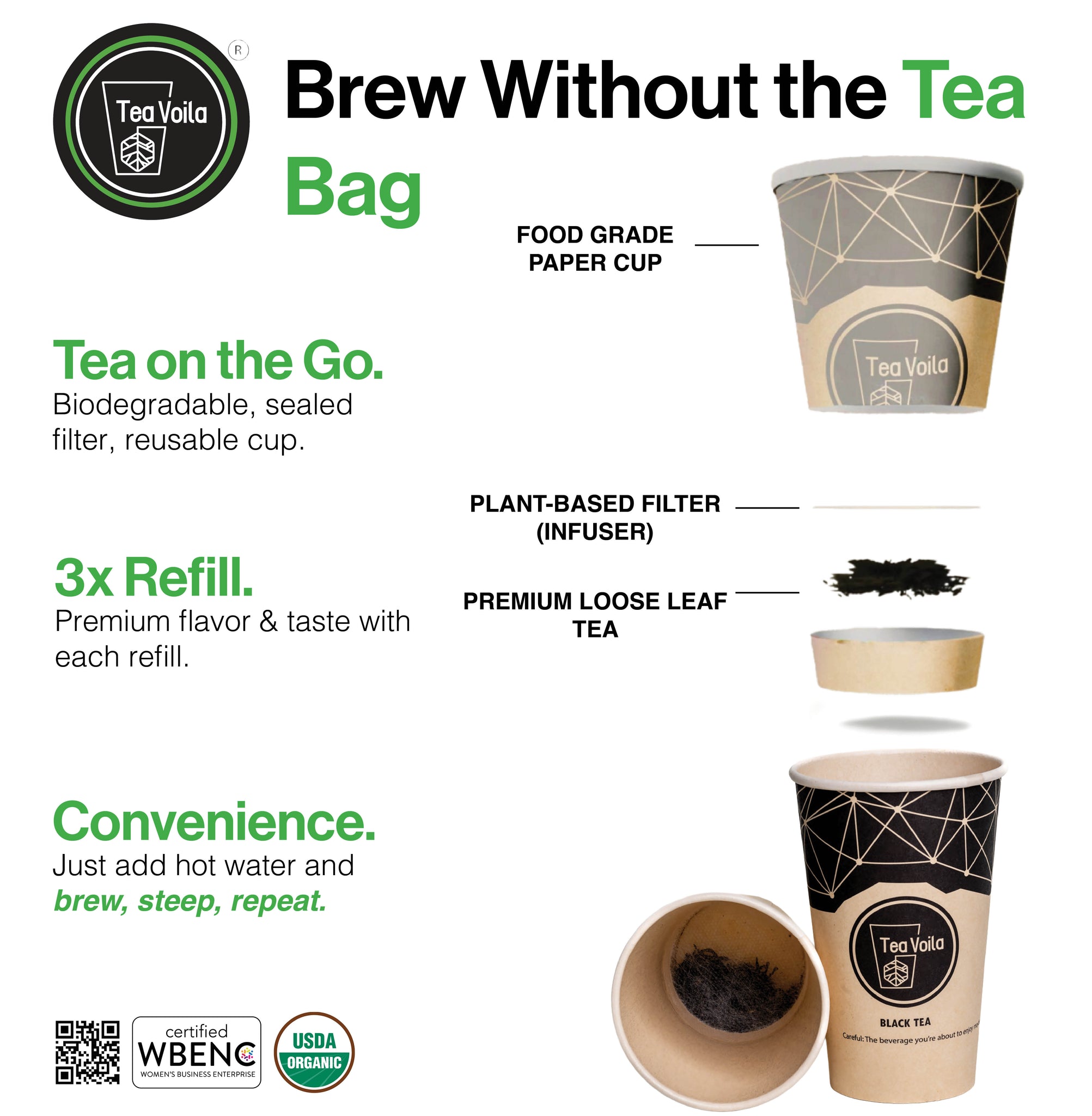 Each TeaVoila package contains 12 ready-to-go biodegradable cups, and you can refill each cup up to three times while maintaining the same delicious taste and aroma. This not only saves you time and money but also reduces waste, making TeaVoila an eco-conscious choice.